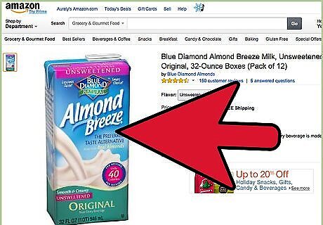 Buy almond milk in bulk online. Certain brands of boxed almond milk are vacuum sealed so they can be kept on the shelf for a long period of time. If you have a large family or a business that uses a lot of almond milk, you can buy in bulk on Amazon.com or BuyTheCase.net.