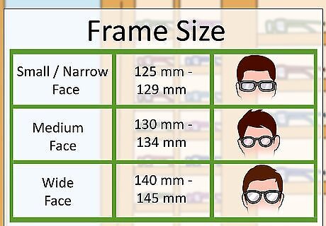 Guesstimate your frame size. If you don't have any current glasses to find your frame size, or if you can't afford to get measured at the optometrist, you can try to guesstimate what size frames you'll actually need. You can use these measurements as a basis for your estimate. These figures are starting points for total width, which includes the lens width (multiplied by two) added with the bridge width – this equals the full width of the frames across your face: Small/Narrow face: 125mm – 129mm Medium face: 130mm – 134mm Large face: 135mm – 139mm Wide face: 140mm – 145mm