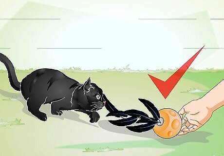 Get toys for general play. Almost all pets respond well to new (or even old) toys. Earning trust through play is an important part of any training process. Get a few new toys as often as you can and rotate them in with the older toys. You can also use access to a favorite toy as a bit of motivation for a difficult part of the training process. Cats, for example, loves toys that make unique noises or are complex to the touch, such as feathers. Other purchases for cats that helps with positive behavior include cat trees, scratchers, food puzzles, and appropriately sized litter boxes.