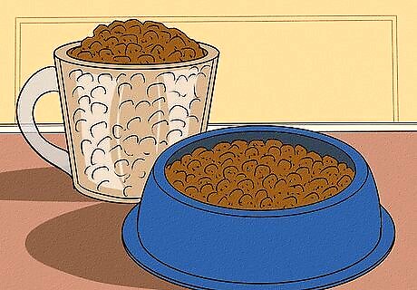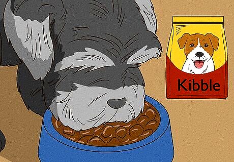 Feed your puppy the proper amount. Miniature schnauzer puppies need to consume approximately 400 calories each day. Check the packaging to see how much this would be of the kibble you are using and measure the appropriate amount. Additionally, keep a steady supply of fresh drinking water available for your puppy. Feed your puppy two or three times a day at the same time. Let your puppy eat for about 10–15 minutes at a time and then discard the uneaten portion. You don’t want to leave it out or your puppy can overeat. Your veterinarian will be able to check your puppy’s growth at visits and let you know whether you are over- or underfeeding him.