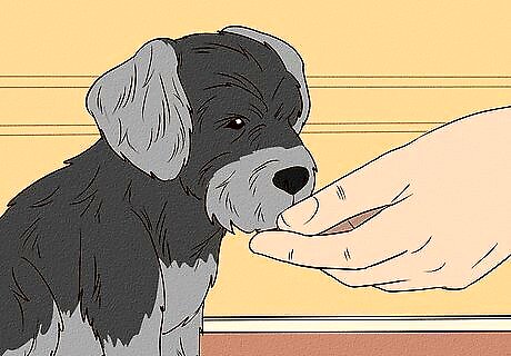Start obedience training early. Miniature schnauzers are smart and highly trainable, but they can also be independent and stubborn. To effectively train your puppy, start soon after he comes home. Be calm and assertive, as well as consistent. Training your miniature schnauzer puppy to sit is a good skill to start with since it will be the basis for many of your commands. Miniature schnauzers are motivated by positive reinforcement (like praise) and treats. They get bored easily, so keep your training lessons short.