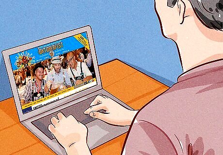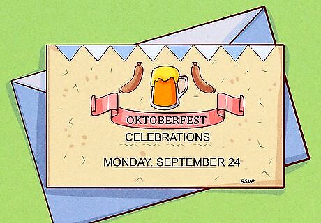 Invite guests a week or two ahead of time. The traditional Oktoberfest party in Munich is enormous, with over 6 million attendees over the course of a few weeks. For a backyard, DIY Oktoberfest party, anywhere from 5-15 guests is a good range. You can invite them through text or e-vites or send out Oktoberfest-themed paper invitations for a fun, traditional flair. You can invite your friends as soon as you start planning, but try to get the word out at least a week or two in advance. Ask them to RSVP so you know how much food and drink to provide. Specify the date and time, and whether guests should bring dishes or beer to share, like a potluck. If you send out paper invitations, decorate them with Bavarian flags, beer mugs, and Gothic-style fonts to fit your theme.