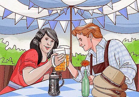 Dress up in dirndls and lederhosen for a fun, traditional look. Many Oktoberfest-goers, both Bavarians and foreigners, deck out in lederhosen and dirndls for the festival. It's not required, but can be a fun excuse to wear a costume and feel like a part of the festivities. You can buy your clothes online beforehand or head to one of the shops in the city that specializes in them.