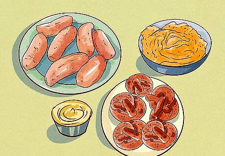Prepare traditional German food, like sausages and sauerkraut. Oktoberfest parties aren't complete without some tasty German foods to soak up the beer. Meat is a must, especially sausages, along with some bread and veggies for variety. Set the food out on the table and encourage guests to help themselves! Must-Have Oktoberfest Foods Meat:Sausages like bratwurst, knackwurst, and frankfurters. You can poach them in beers and onions for an extra burst of flavor.Wiener schnitzel, a traditional German fried meat Condiments:Beer cheese, a cheese spread with a full, wheaty tasteA homemade or store-bought mustard spread Bread and SidesRollsSoft pretzelsSauerkraut, a tasty, sour cabbage dishPickles