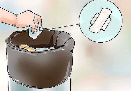 Wrap and dispose of the pad. Once the pad is off, wrap it in a piece of toilet paper. You can also wrap it in the packaging from the new pad. After this, dispose of the pad in a special container or trash bin. Put the old pad in a disposal box for sanitary napkins or trash can. Put it in a covered trash can so that pets or small children can’t get the pad. Avoid flushing the pad down the toilet, which can back up the septic system and create a huge mess.