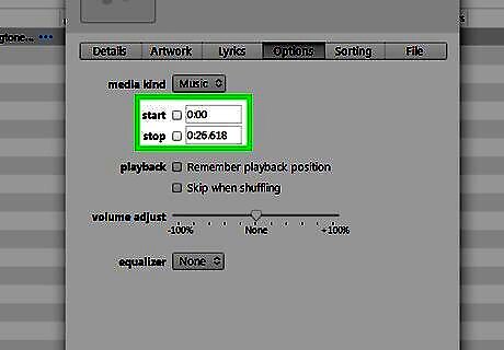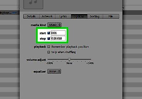Enter time parameters next to “Start” and “Stop” to indicate the part of the song you want used as the ringtone. The maximum ringtone length is 30 seconds, so the time parameters you enter must only be for 30 seconds of the song. For example, to use the first 30 seconds of the song as your ringtone, enter “0:00” next to Start and “0:30” next to Stop.