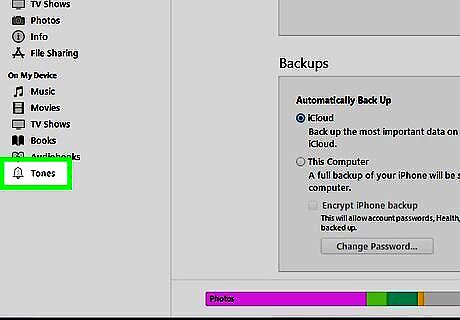 Click on the three dots at the top left corner of iTunes and select “Tones.” This opens the My Tones window.