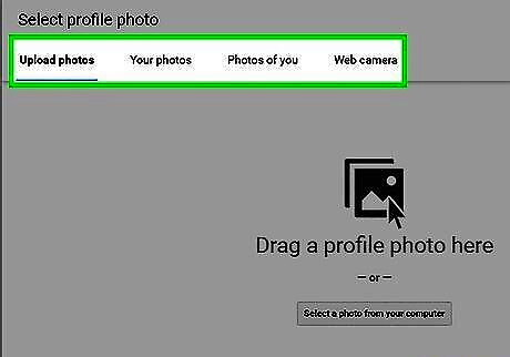 Choose your method of selecting a picture. A large box will pop up after your click your picture, and will have four tabs: "Upload photos", "Your photos", "Photos of you", and "Web camera". There are three methods to selecting a picture. Uploading a photo from your computer. For this option, stay on the "Upload photos" tab and click the button "Select a photo from your computer", or you can just drag the photo onto the box as it directs you to. Choosing photos from Google Plus. For this, click on either "Your photos" or "Photos of you". These tabs will give you photos you have shared on Google Plus or saved to Google, OR photos you have been tagged in. Take a picture. For this, click on the tab "Web camera". This will only work if you have a web camera, so make sure you have one before clicking on this tab. This tab allows you to take a picture using your web camera right there on the spot.