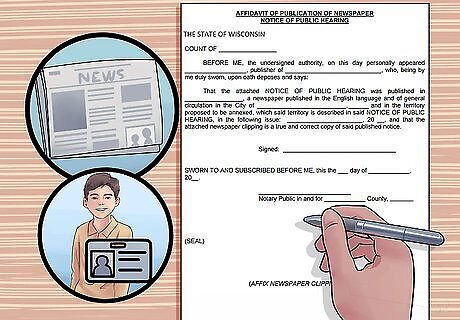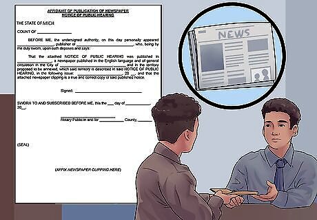 Publish legal notice of your name change. Call the Clerk of District Court for the name and phone number of the bailiff or hearing scheduler you must contact to schedule your hearing. Schedule your hearing for six weeks later in order to have ample time to publish legal notice. Write down the hearing date to use to complete the Legal Notice form. You must have the legal notice published in your local newspaper once per week for four consecutive weeks, and you must also have the newspaper provide the court with proof that the notice was published accordingly. This proof will come in the form of an affidavit.