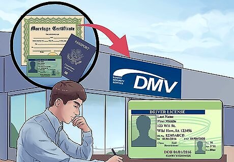 Change your name on your driver's license or state ID. Provide a current Nebraska driver’s license (with photo), a non-expired U.S. passport, or your Social Security card to your local DMV office along with an Operators License-ID data form. Also, provide proof of your name change, such as your marriage certificate (original/certified copy), record of divorce (certified), or U.S. passport showing your new name. You will have to surrender your current driver's license with your old name, and pay a fee. Check with the DMV office to find out the fee. You will also have to provide proof of address.