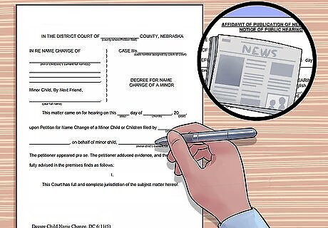 Publish legal notice of your child's name change. Call the Clerk of District Court for the name and phone number of the bailiff or hearing scheduler you must contact to schedule your hearing. Schedule your hearing for six weeks later in order to have ample time to publish legal notice. Write down the hearing date to use to complete the Legal Notice form. You must have the legal notice published in your local newspaper once per week for two consecutive weeks, and you must also have the newspaper provide the court with proof that the notice was published accordingly. This proof will come in the form of an affidavit.