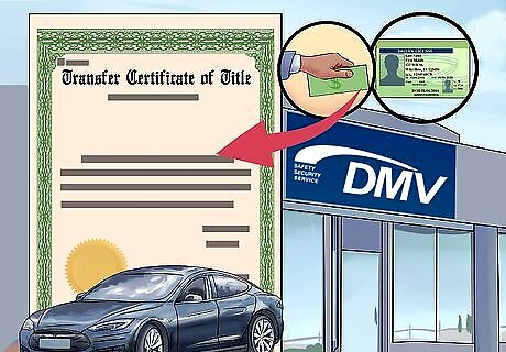 Change your name on your car title and registration. Visit your local DMV office in person to change your name on your vehicle registration and title. You may have to apply for title transfer or duplicate certificate of title with your new name. Bring your driver's license and be prepared to pay a fee. You can find out the fee total by contacting your DMV office directly before you go.