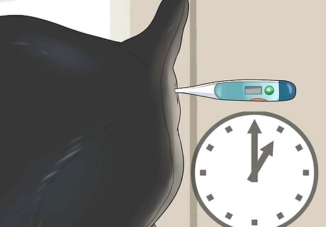 Have another individual restrain the dog's body. Have the other person give the dog a “hug” by placing his or her left arm under the neck of the dog and using his or her left hand to hold the side of the dog's face against the shoulder. Your helper will then place his or her right arm under the belly of the dog just in front of the back legs to keep the dog standing. It is not uncommon for a dog to want to sit down when they feel a rectal thermometer inserted. If your dog is comfortable lying down and stays there for the temperature taking, then you can leave them lying down. Sitting is not the preferred position because the rectum will not be easily accessible.
