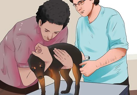 Be cautious. If you have any indication that the dog may bite or you may injure the dog while trying to restrain your pet, stop! It is better to wait and take your dog to its veterinarian to get its temperature taken than to risk injury to the dog or yourself.