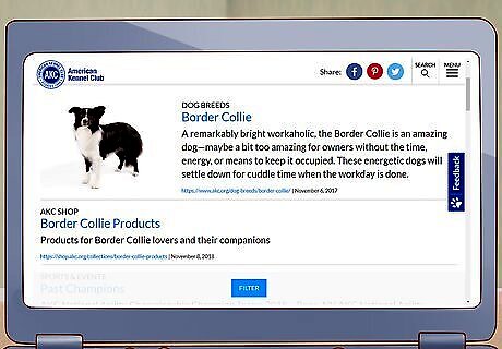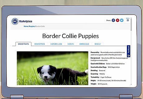 Research the breed. Get to know the characteristics of the border collie. Spend some time looking online at dog breed websites, such as the American Kennel Club (AKC). Many of these sites will provide the history of the collie as well as some useful care tips. You can also talk to any friends who own collies and ask them about their ownership experiences. If you need additional guidance you can talk with a dog breed consultant in your local area or online.