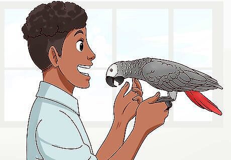 Interact with the African Grey. It might seem like the African Grey picks you instead of the other way around. Spend lots of time with the birds to learn about their individual behaviors. Handle the parrots to find out how they act around you. Remember that there's no rush in choosing an African Grey. You can take as much time as you need to find the right one for you. If you have family members or roommates that will be around the bird a lot, bring them with you to select the bird. This will give you a chance to see how they interact.