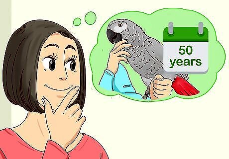 Commit to caring for your bird. If you'd like to get a pet parrot, ask yourself if you're willing to care for it for a long time. If so, you'll be responsible for maintaining it, feeding it, and interacting with it for a long time. African Grey parrots can live up to 50 years. Consider how much time you spend at work or away on vacation. A parrot represents a similar level of commitment as a dog, so if you don’t have the time to play, cuddle, or socialize a dog then a parrot isn't for you.