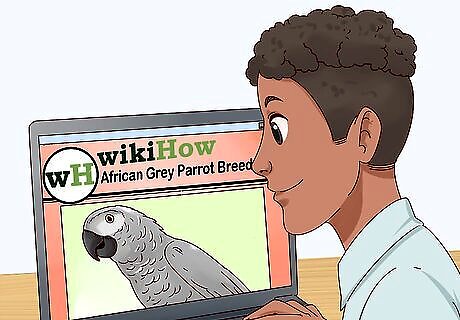Find a reputable breeder. Do your research when it comes to finding a supplier of African Greys. Try to find a recommended breeder or animal sanctuary that is knowledgeable about the birds. Look for a place that specializes in parrots, especially African Greys. If you find a bird advertised online or in the newspaper, ensure that it's coming from a good place and that you can see the bird in person before you buy it. Some unscrupulous people breed birds solely for profit and care little about their welfare. Avoid purchasing birds from online ads or from someone who shows little interest in the bird's new home. A reputable breeder will ask you lots of questions to ensure they are placing the bird in a safe, good place.