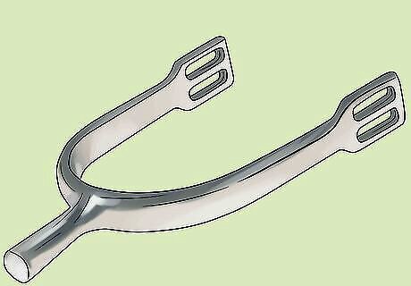 Select a shank. Shank Shape comes into play when you ride Western. When you sit in a Western Saddle your leg is pushed forward and out. Whereas if you sat in an English or A Dressage saddle, your leg is almost flat against the horses side. This will determine whether or not the spur will need to be straight or curved and to what degree. Western spurs already are curved and you can buy them in varying degrees. It is best to ride your horse with no spur and get a feel of where your leg is in reference to the horses side and how he is traveling. A general guide is if you can feel the horses side then a short shank with a lesser degree of curve is needed, as you are less able to feel the horses side, a longer shank and a higher degree of curve is needed. English spurs already have a slight bend, allowing for close contact, these spurs do not come in varying degrees.