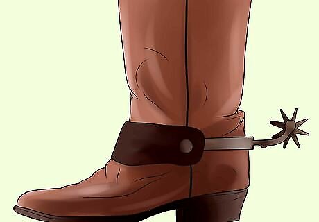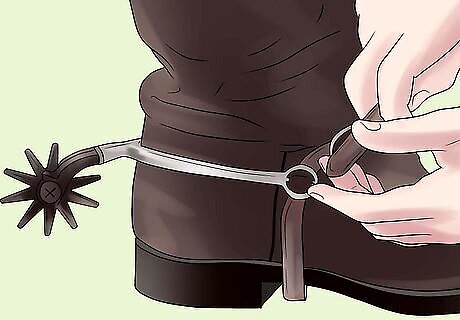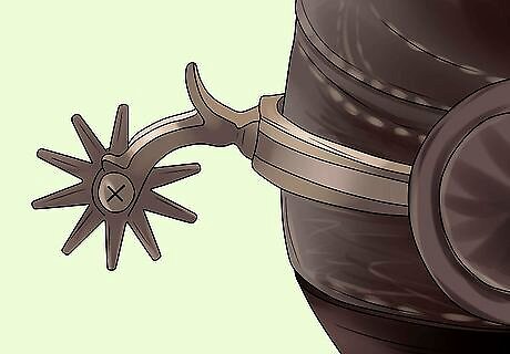 Choose the right spur for you. If you're competing in a Western Class as a show, you will notice that many of the riders have flashy spurs. Shiny silver and gold that jingle and jangle. There is no need for a lot of noise in a spur, though it's a personal choice. Compare this to Dressage Riders, you will notice that the spurs often are longer for the advanced riders, and the top riders also have a Rowel on their English Spur. In all cases, refer to the rules of the show and if unsure, contact the Show Office for guidelines and restriction on spur size and shape.