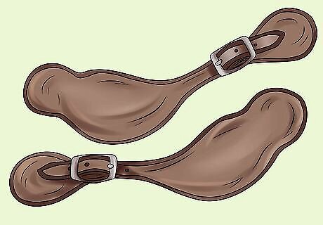 Choose the right strap. Straps come in various shapes and sizes depending on the use of the spur and the event it is being used for. Many English Spurs have two types of straps; Leather vs. Synthetic. Both straps are good, and it all depends on what type of riding you are doing. If you are doing low level dressage or Pony Club etc, then a synthetic strap would be best, they are all weather durable and you can chuck them around in your tack box without having to worry about oiling them. If you're riding higher level dressage, show riding or hunter classes, then leather is probably the best choice. They have a classier look and often are more likely to match the colour of your boot, as they come in tan, brown and black. Like all things leather, regular oiling is needed. Leather however are less weather resistant, and if left un-oiled or left in the sun, can become dry and brittle. The spur will also wear more under the sole where the boot will rub against the spur, causing it to become thin in time. Western spur straps are much larger and bulkier looking than English straps. And often they have more detail to the design. Generally a Western strap is leather, though you can by synthetic straps. They have a bigger buckle compared to the English spurs, and often sizing is limited Whereas English straps can be used on children through to men sized boots. Western straps come in varying colours and patterns. They don't have to match your boot colour; patterns can vary from thatched to woven leather and from silver studded all the way to fancier straps with crystals and gems. They require oiling and will need to be well taken care of, as English straps are generic, whereas Western spur straps are few and far between and only specialty saddleries stock them.