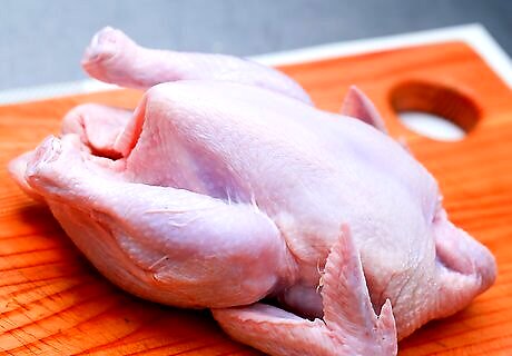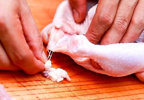 Remove the chicken from its packaging. Cut open the plastic packaging and take out the chicken. If the chicken is trussed with twine, plastic, or a rubber band, use a knife to cut any trussing materials and remove them from the chicken. Throw away all the packaging materials.Warning: The CDC does not recommend washing raw chicken, since doing so can spread dangerous bacteria. Take care when you remove the plastic wrap not to spill any juices that have pooled inside.
