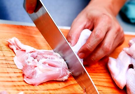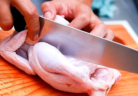 Cut off each wing where it connects to the breast. Grab one of the wings and wiggle it a little to help you find the joint that attaches it to the side of the breast. Use the end of a sharp kitchen knife to cut through the skin and joint and separate the wing from the body. Repeat the process on the other side. Tip: If the chicken is wet from thawing or sitting in the juices in the package, pat it down with a dry paper towel before you start cutting. This will make the skin less slippery and easier to cut. Pressing your thumb against the spot where the wing meets the body can make it easier to find the joint. If you pull up on the wing while you make the cut, the weight of the chicken will help make the separation easier. Ideally, you should use a sharp boning knife for this purpose. Always keep your fingers out of the way and use caution when working with sharp knives.