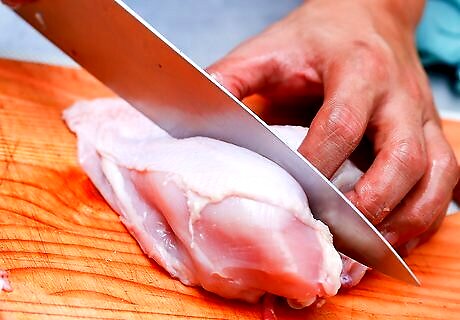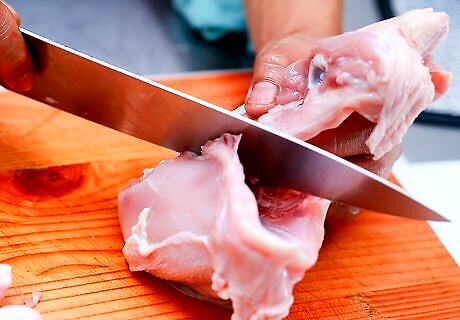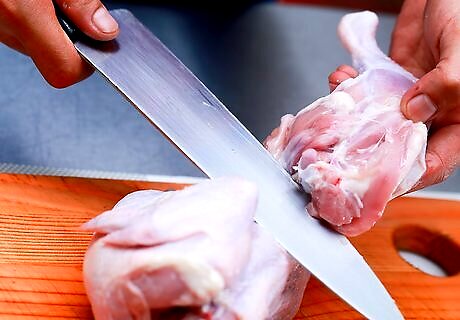 Cut through the breastbone to separate the breasts. Flip the breast over skin-down on the cutting board and make a small slit in the middle of the bone from the back. Then, flip the breast back over and push down on it with both hands to break the bone. Pull the breast halves apart slightly, then slice through the middle of the breast with your knife to separate them. Alternatively, you can cut directly through the breastbone from the back. You’ll need a lot of elbow grease to do this. Fold a kitchen towel and put it over the dull edge of your knife, then push down hard on the blade with your hands to force the knife through.