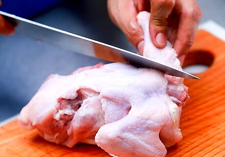 Find the thigh joint and cut through it. Examine the cut you just made and find the joint where the thigh attaches to the body. You may find it helpful to wiggle the leg a bit to determine exactly where the joint is. Cut through the joint with your knife once you find it. Repeat this cut on the other thigh. You can also bend the thigh back to pop the joint out of its socket. This will make the joint even easier to find and cut. The joint will be located far down on the side of the chicken’s body, close to the back.