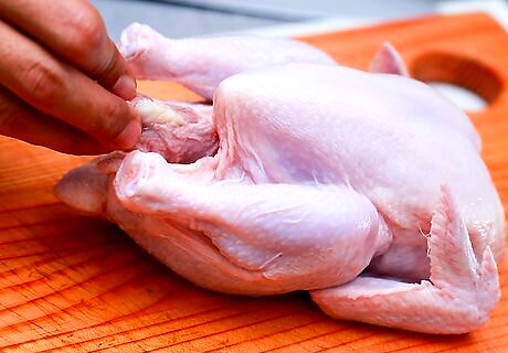 Put the chicken breast-up on a clean cutting surface. After you take the chicken out of its packaging, put it down on a sterile cutting board or a large plate. Put the chicken on its back with the breast facing up. Tip: To prevent other foods from getting contaminated, it’s a good idea to reserve 1 cutting board just for preparing raw chicken. You may wish to lay down some paper towels on your work area before you start to prevent any blood or juices from splashing on your counter.