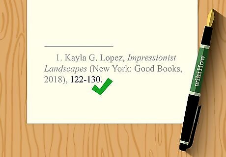 Finish the citation with the page numbers followed by a period. This tells the reader the exact pages of the book where they can find the information you’re citing. If you’re citing more than 1 page, separate the page numbers by a dash. Finally, put a period at the end of your citation. You don’t need to write “page” or “pg” before the numbers. You just need to include the actual page numbers. Here’s what a complete footnote will look like: Kayla G. Lopez, Impressionist Landscapes (New York: Good Books, 2018), 122-130.