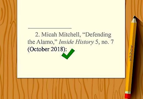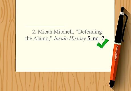 Include the issue and volume number for journal articles. Most academic journals include volume and issue numbers. Put the issue number first, then put a comma. Write no., then the issue number. Do not use any punctuation after the issue number. Here’s what your footnote would look like now: Micah Mitchell, “Defending the Alamo,” Inside History 5, no. 7