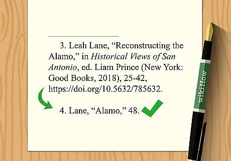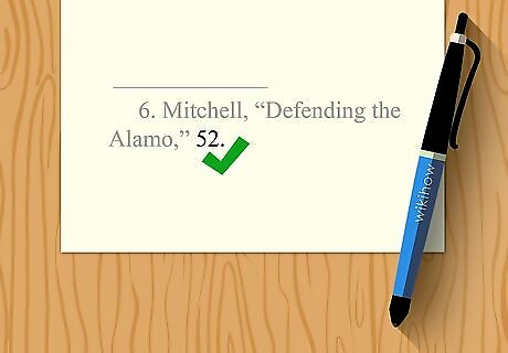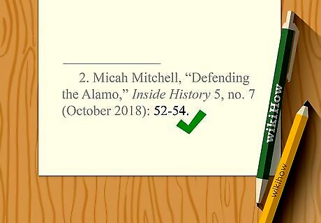 Put the page numbers for a journal or book. This tells the reader exactly where you got the information you’re citing. If you’re citing more than 1 page, separate the numbers with a dash. End a book footnote with a period, but put a comma if you’re citing a journal. You don’t need to write “page” or “pg.” Here’s what your footnote will look like: Leah Lane, “Reconstructing the Alamo,” in Historical Views of San Antonio, ed. Liam Prince (New York: Good Books, 2018), 25-42, Micah Mitchell, “Defending the Alamo,” Inside History 5, no. 7 (October 2018): 52-54.