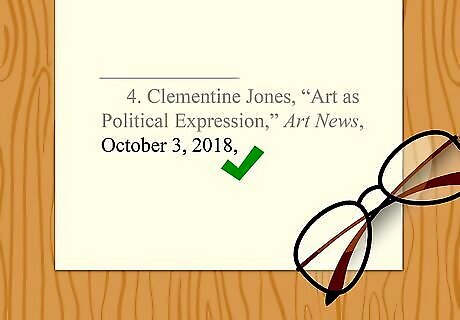 List the date followed by a comma for news or magazine articles. You don’t need to use parentheses for the date of a news or magazine article. Write out the full date, then put a comma at the end. Here’s what a footnote for news or magazine article would look like so far: Clementine Jones, “Art as Political Expression,” Art News, October 3, 2018,