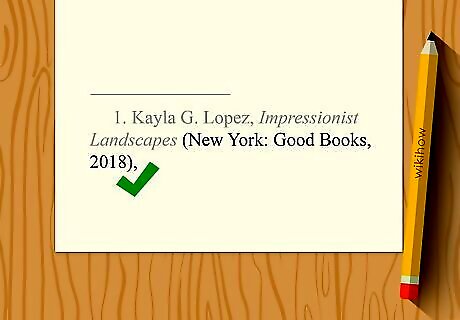 Put the publisher’s city, name, and date in parentheses, then a comma. Put the date first, followed by a colon and the publisher’s name. Place a comma after the name, then write the date of publication. After the parentheses, put a comma. This is what your footnote will look like at this point: Kayla G. Lopez, Impressionist Landscapes (New York: Good Books, 2018),