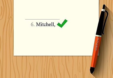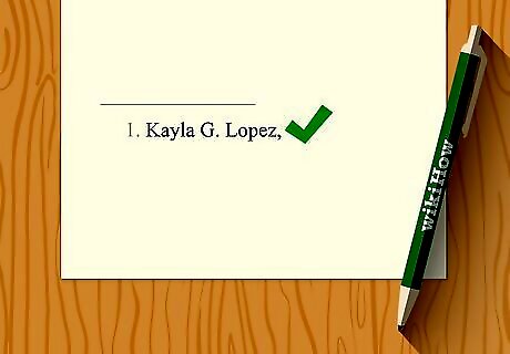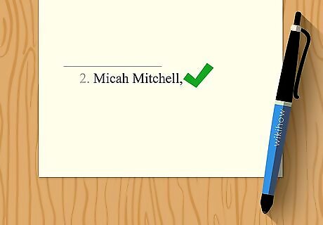 Write the author’s first and last name, then a comma. List the first name, the middle name or initial if it’s provided, then the last name. Put a comma after the last name to separate the author’s name from the title. As an example, you’d write “Micah Mitchell,” Separate 2 or more authors with the word “and.” For example, “Micah Mitchell and Leah Lane,” If there are 3 authors, you’d write them like this: “Micah Mitchell, Leah Lane and Kyle Thomas,” For more than 3 authors, you’ll write the first author’s name and et al., which means “and others.” It would look like this: “Micah Mitchell et al.,”