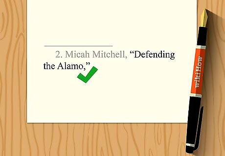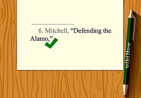 Put the article title or chapter in quotation marks followed by a comma. Use the name of a section within a book, if that’s what you’re citing. Capitalize the title’s first word, as well as every word except for the articles “a,” “an,” and “the,” infinitive “to,” prepositions “against,” “between,” “in,” and “of,” and conjunctions “and,” “but,” “for,” “yet,” “so,” “or,” and “nor.” Put the comma inside the closing quotation mark. Your citation might look like this: Micah Mitchell, “Defending the Alamo,”