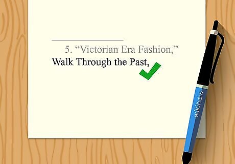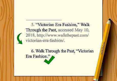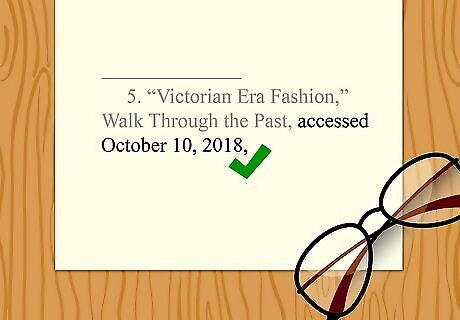 Give the last modified or access date followed by a comma. A last modified date is listed on some websites. It tells you when the site’s host last updated the information. Use this date if it’s available. If you don’t see a last modified date, then use the date you accessed the site. Here’s what your footnote should look like now: “Victorian Era Fashion,” Walk Through the Past, accessed October 10, 2018,