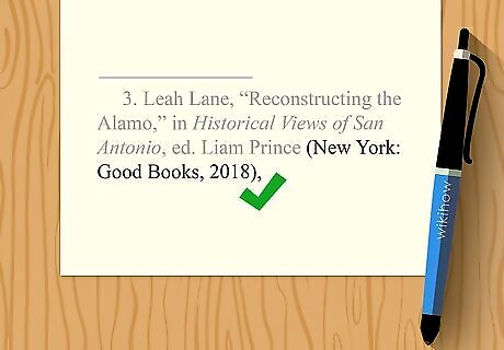 Put the publisher’s city, name, and date in parentheses for a book. List the city name first, a colon, and then the name of the publisher. Write a comma, then put the book’s date of publication. After the parentheses, put a comma. This is what your footnote will look like at this point: Leah Lane, “Reconstructing the Alamo,” in Historical Views of San Antonio, ed. Liam Prince (New York: Good Books, 2018),