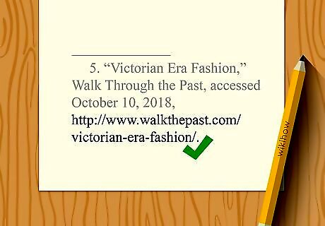 Put the full web address, then a period. Write out a link to the page where you got the information so that readers can easily find it. Finally, put a period at the end. This is what your full footnote will look like: “Victorian Era Fashion,” Walk Through the Past, accessed October 10, 2018, http://www.walkthepast.com/victorian-era-fashion/.