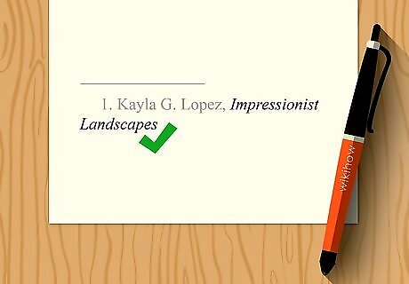 Include a book title in italics. Use italics for a hardcopy book, e-book, or translated book. Capitalize the first word in the title and every other word except for the articles “a,” “an,” and “the,” prepositions “against,” “between,” “in,” and “of,” infinitive “to,” and conjunctions “and,” “but,” “for,” “yet,” “so,” “or,” and “nor.” If your book was translated, place a comma after the title. Then, write “trans.” followed by the translator’s name after the title. Here’s what your citation might look like at this point: Kayla G. Lopez, Impressionist Landscapes Ming Chin, Emotions in Brush Strokes, trans. Ann Patterson