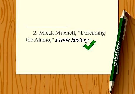 Put the book, journal, or publication name in italics. This is the title of the publication in which the article or chapter appears. If there is no issue and volume number, place a comma after the publication name. However, you will not put a comma if there is a volume and issue number, as with an academic journal. If you used a chapter from a book, then you’ll put the word “in” before the book’s name. Here are examples: Micah Mitchell, “Defending the Alamo,” Inside History Leah Lane, “Reconstructing the Alamo,” in Historical Views of San Antonio,