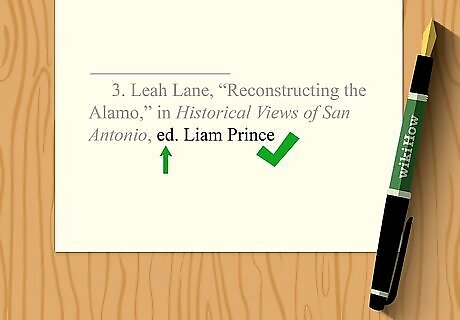 Write ed. followed by the editor’s name for an edited book. Include the editor’s full name as provided on the book’s title page, starting with their first name. Do not use any punctuation after the editor’s name. Here’s what your citation will look like now: Leah Lane, “Reconstructing the Alamo,” in Historical Views of San Antonio, ed. Liam Prince