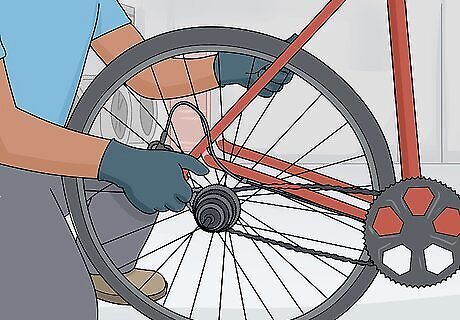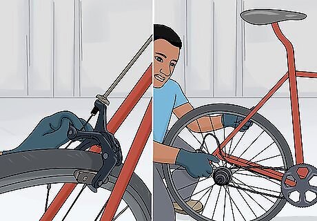 Shift to the lowest gear and disengage the rear brake. Set your bike on a bike stand or use the kickstand to stabilize it on the ground. Use the gearshift on your right handle to shift to the lowest gear available, which will loosen the chain. Unlock your rear brake by pulling down on the metal bracket that holds the brake cable in place. On some bikes, you can disengage the rear brake by twisting a lever on the side of the brake. You can also unscrew the brake pad itself by loosening the nut on top of the pad with an Allen wrench as well.