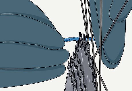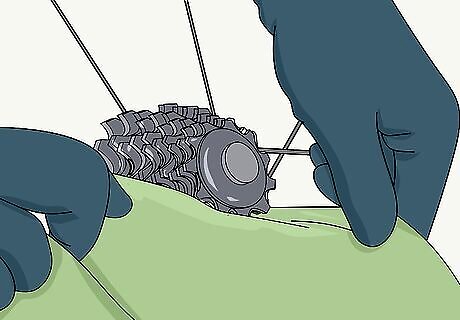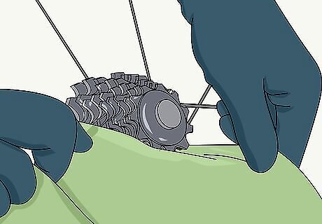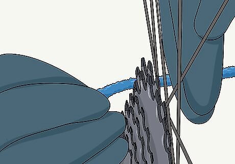 Pull a side of the cloth taut and slide it under the first cog. Grip a long length of the cloth with both hands and pull it tight so that you have a 6–8 in (15–20 cm) length of fabric pulled taut. Starting with the smallest cog on the front of the cassette, slide the length of cloth under the cassette and work it in between the first and second cog on the assembly. If the cloth won’t slide in between the individual cogs, get a thinner cloth. It shouldn’t be too hard to slide the cloth into place, though. Cleaning in between the cogs with a cloth will remove any debris that’s sitting in between the individual components of the cassette. The cleaner these pieces are, the less resistance there will be when you pedal your bike.
