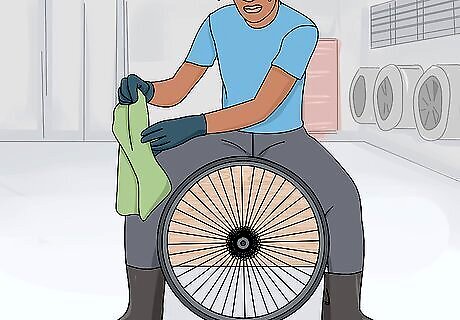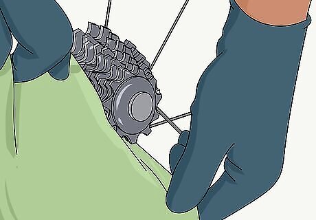 Grab a rag and sit down with the wheel between your legs. You can use any type of cloth or rag for this. Set a chair out and sit down with your legs spread. With the cassette facing out and away from you, slide the wheel in between your legs. Wrap your knees and shins around the rubber tire to hold the wheel in place.Tip: You can soak the cloth in a degreaser if the cassette hasn’t been cleaned in decades, but it’s usually unnecessary. A little oil or grease is healthy for these pieces anyway, since you don’t want the cogs to rub against one another without being lubricated. The cassette is an especially strong part of your bike. It experiences a lot of friction and movement from the chain every time that you ride, so you don’t need to use a microfiber cloth or anything like that. The cassette is kind of difficult to remove and reassemble. It’s a lot easier to clean it without removing it from the wheel.