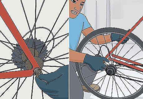 Turn the release skewer counterclockwise to remove the rear wheel. The release skewer is the metal lever located in the center of the hub. Grab the release skewer and turn it counterclockwise 5-10 times until you don’t feel any resistance as you turn it. Then, hold the frame of the bike with one hand and the wheel with your other hand. Lift the frame up while sliding your rear wheel out to remove it. As you’re lifting the bike up, you may need to slide the chain and the rear bracket to the side to clear the cassette.
