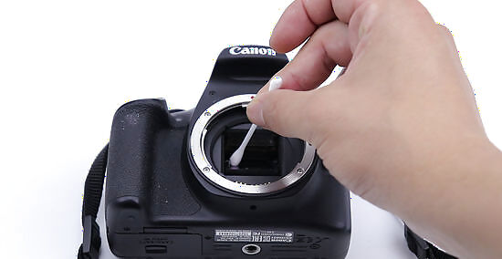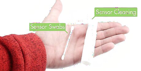 Purchase sensor swabs and a sensor cleaning solution. Go online or check at an electronics store for sensor swabs and a specialized DSLR sensor cleaner. DSLR cleaners leave a coating on the sensor that can repel dust and minimize future build-up. Sensor swabs are soft and sterile, and won’t leave residual hair or dust on your sensor. Do not use regular cotton swabs or general soaps or cleaners on your camera. Sensor cleaning solutions typically come in small, squeezable dropper bottles. Sensor swabs are small with soft, triangular heads. Look for one made for your camera’s sensor size, which you can find in your camera’s instruction and information manual.