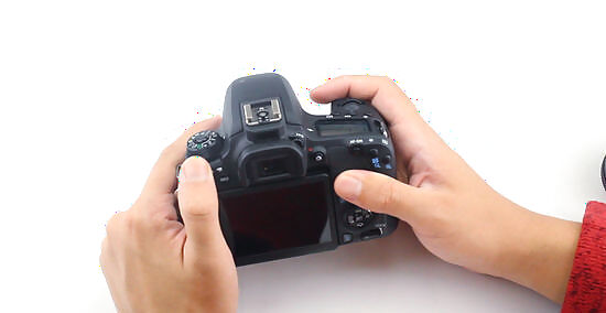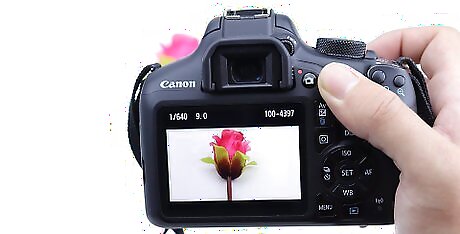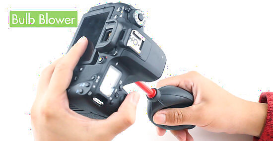 Turn the camera upside down and blow a bulb blower on the sensor. Hold the camera up in one hand and turn it upside down. In your other hand, hold up a bulb blower so that its tip is 1 inch (2.5 cm) to 2 inches (5.1 cm) away from the sensor. Squeeze the blower 10-20 times, shooting air onto the sensor to blow away the dust. Bulb blowers can be bought online or at electronics stores. Do not use canned air blowers on your DSLR sensor. The pressure is usually strong enough to damage your sensor. Holding the camera upside down as you blow will ensure that all the dust particle fall down and away from the sensor, instead of settling back on top of it.