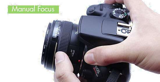 Turn on your camera's manual focus. To catch all the dust and debris on your sensor when you take the picture, you'll want the photo to be out of focus. If taking the picture indoors, set the focus to infinity. If taking it outdoors, set it to close-focus.